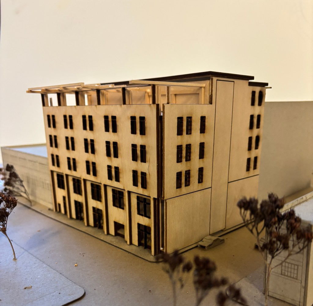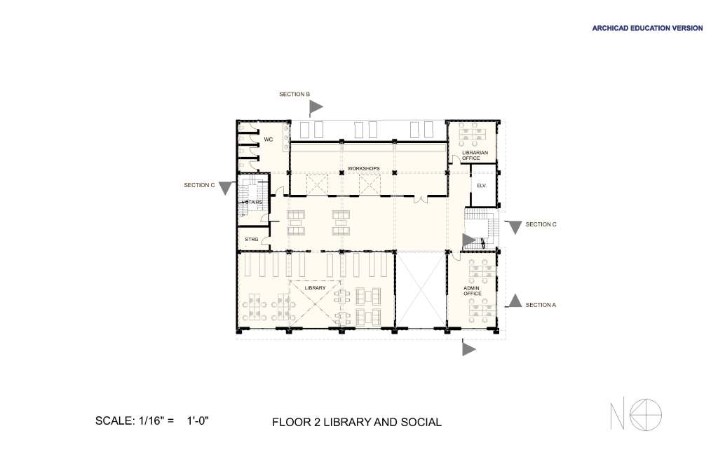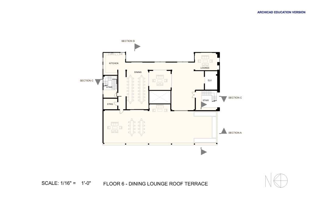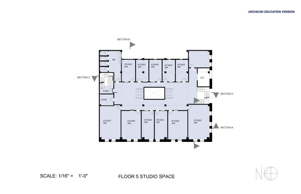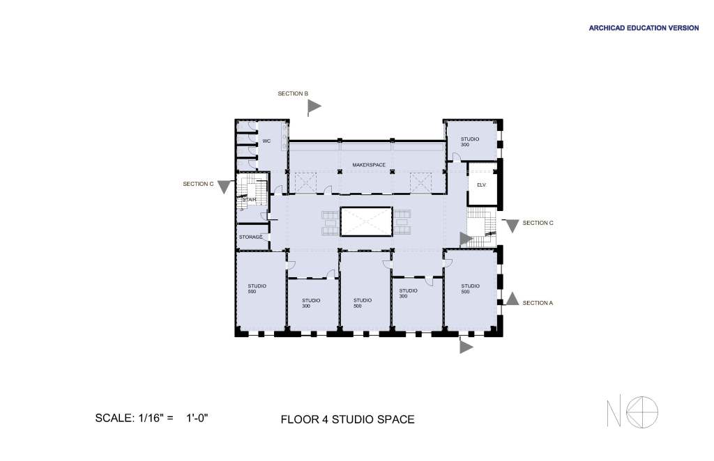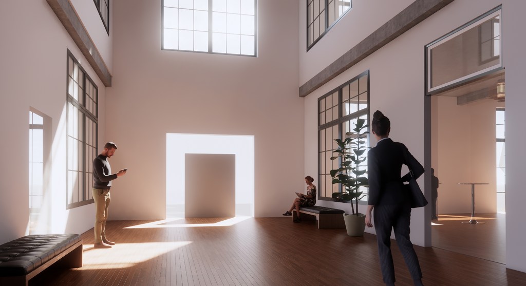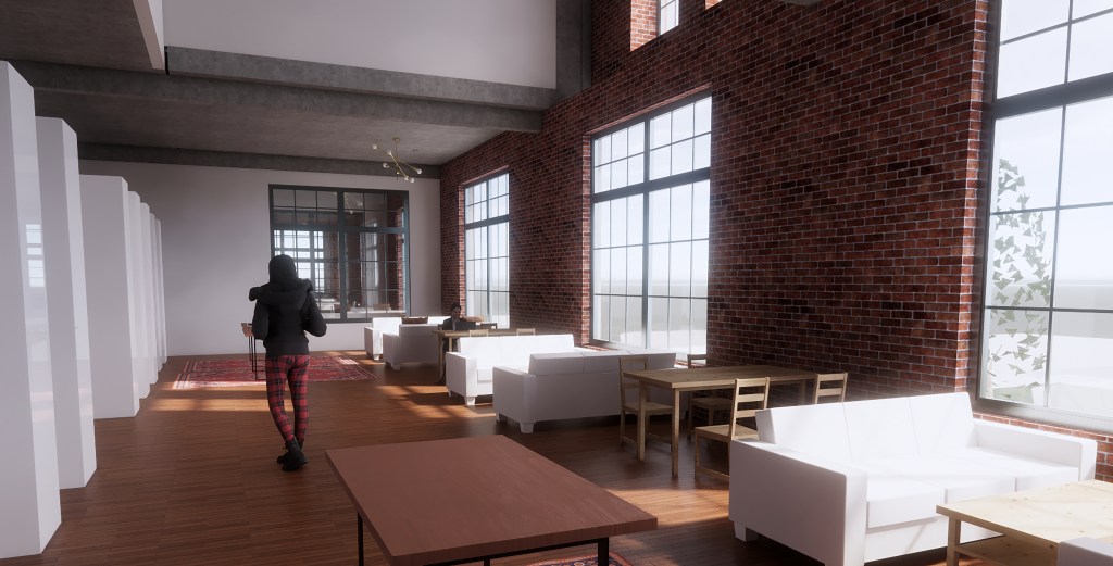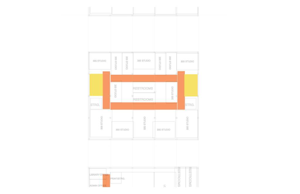 Rising above, the third, fourth, and fifth floors are dedicated to the artists, offering studio spaces, makerspaces, and a shared social seating integrated into the circulation that fosters connection. The sixth floor is the more formal social space for the artists with a communal dining hall, kitchen, and a rooftop terrace.