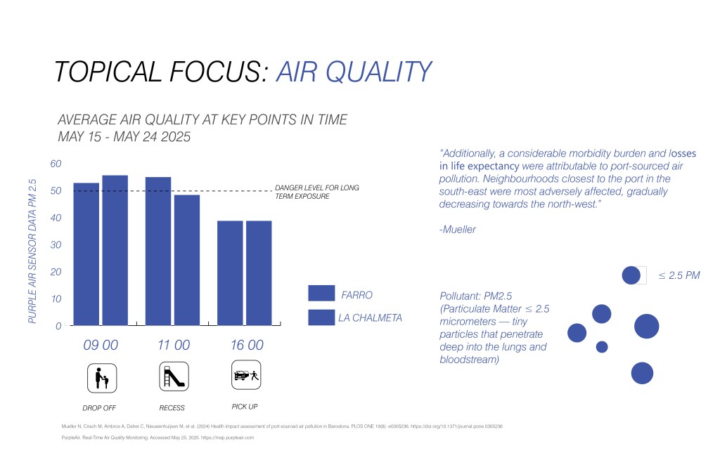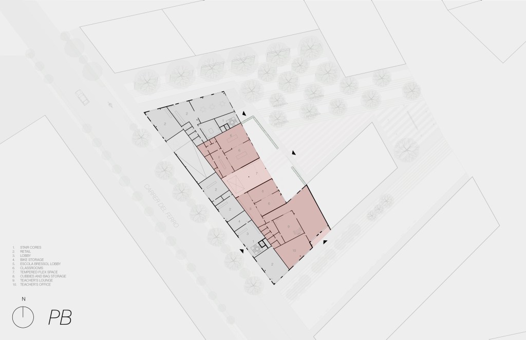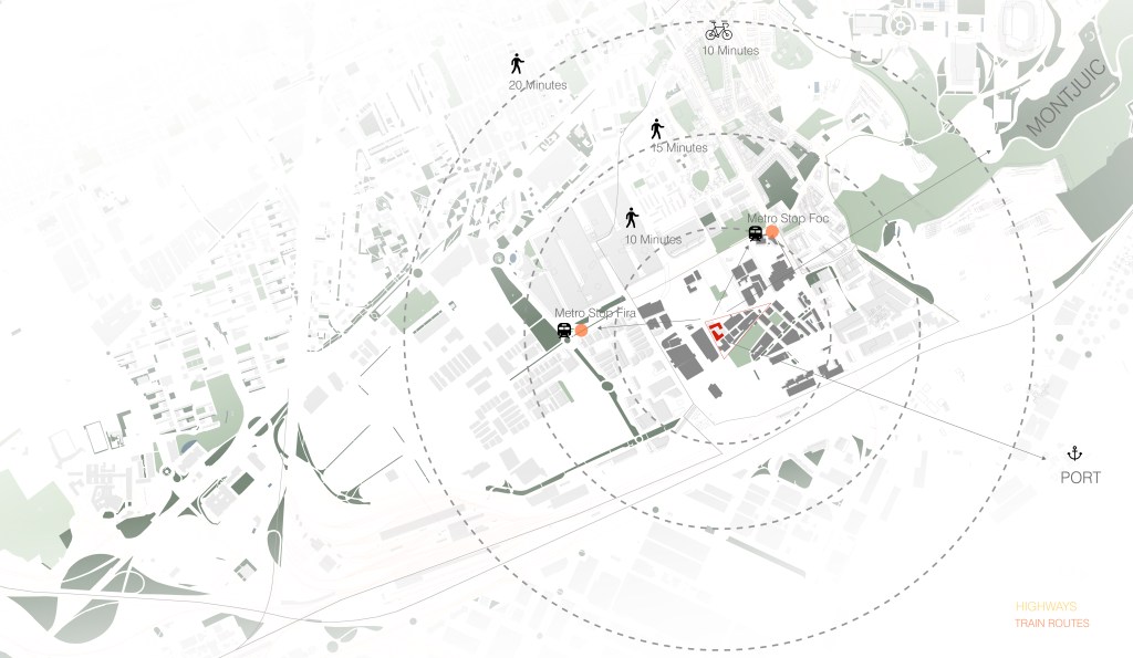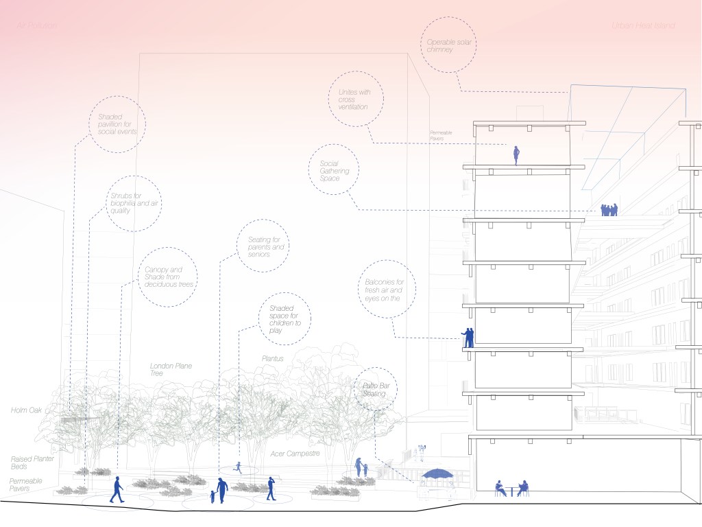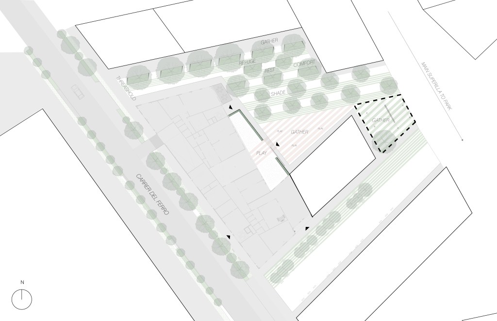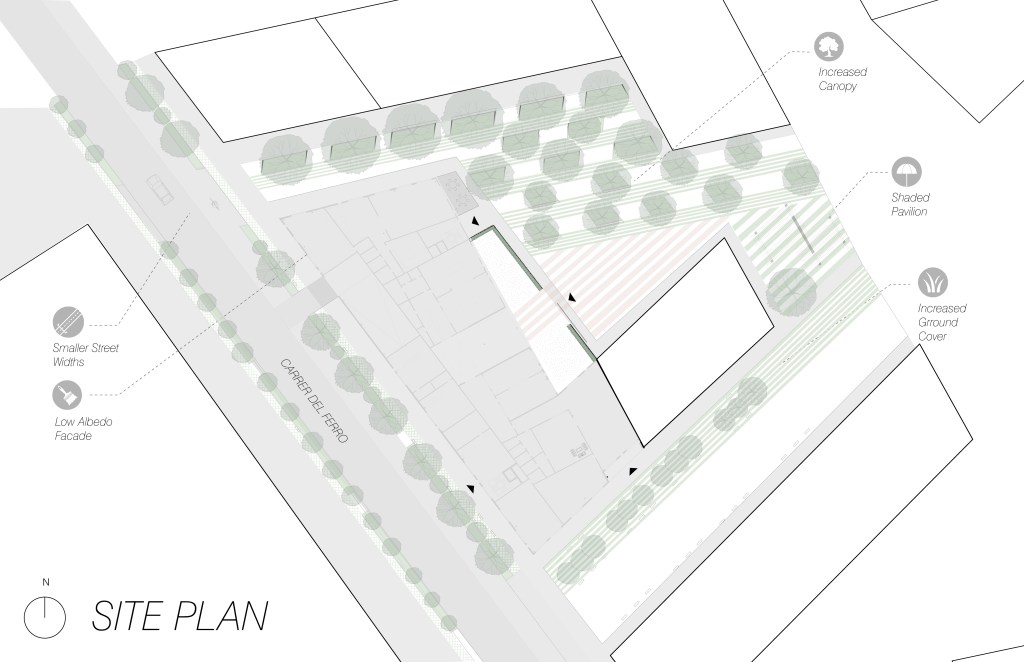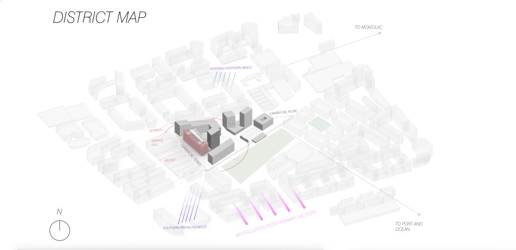 Rising summer temperatures and poor air quality disproportionately affect children and seniors in Marina del Prat Vermell. This project organizes housing and childcare around shaded courtyards and filtered air corridors, using environmental data to locate program and form