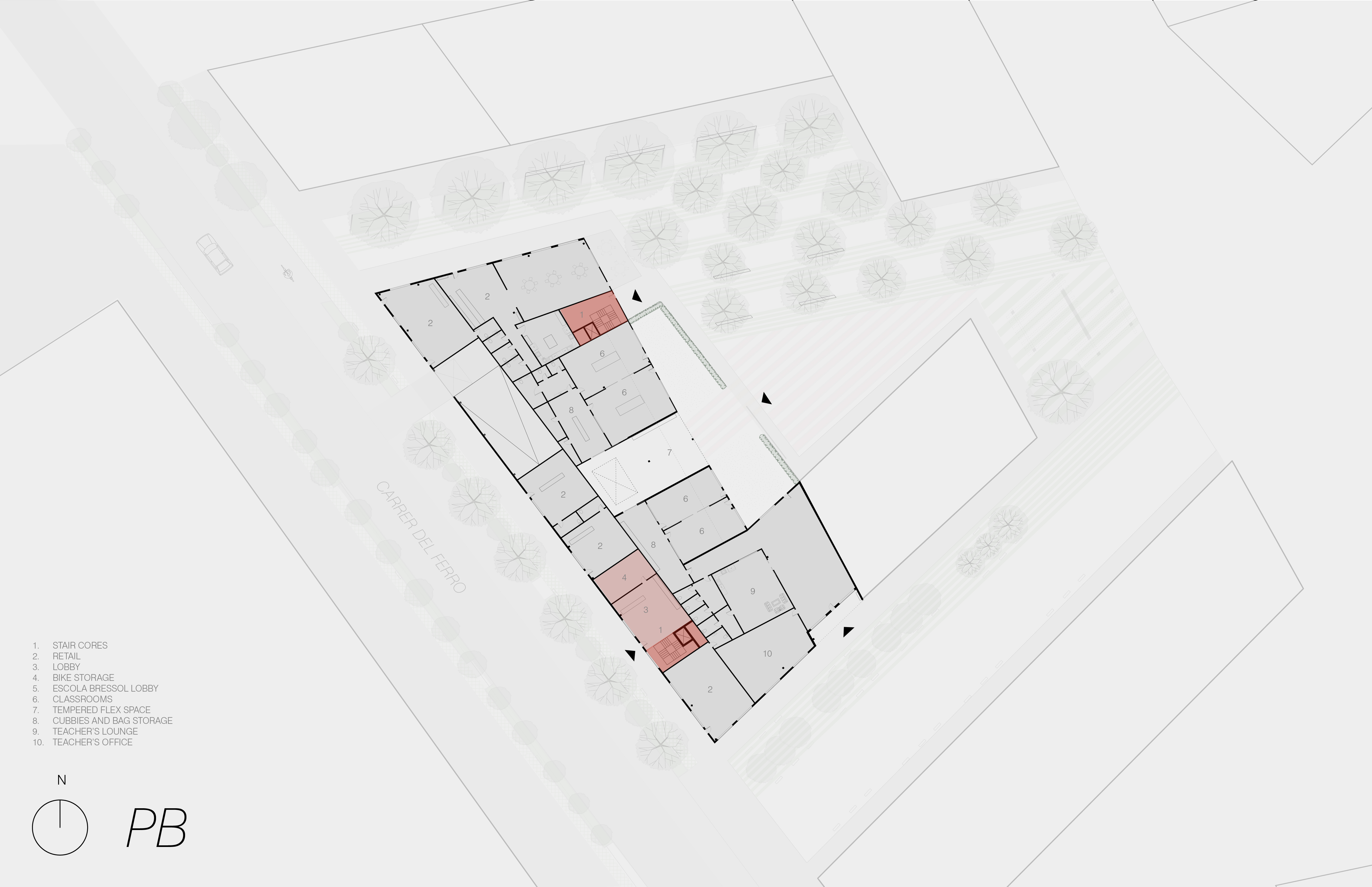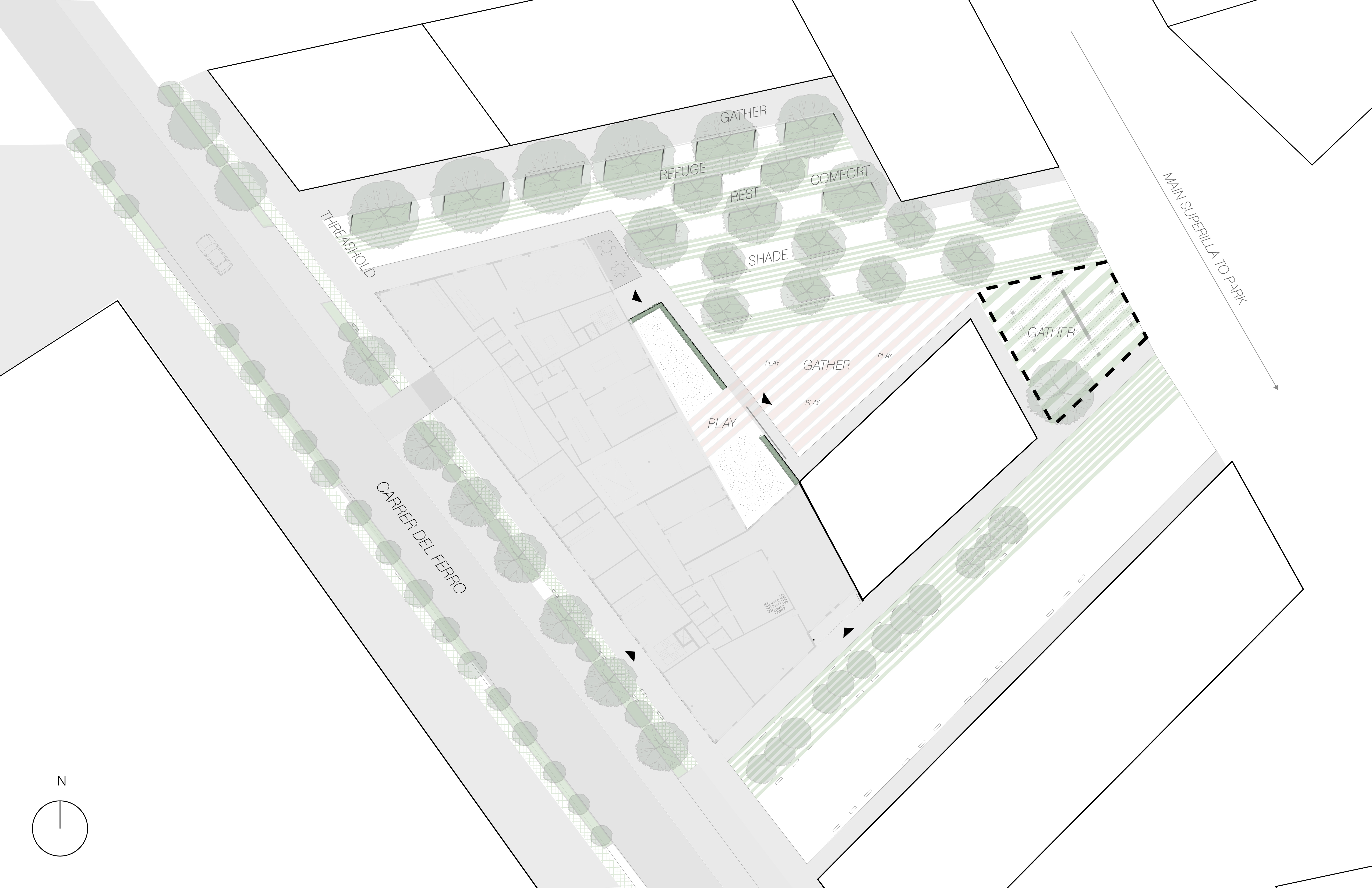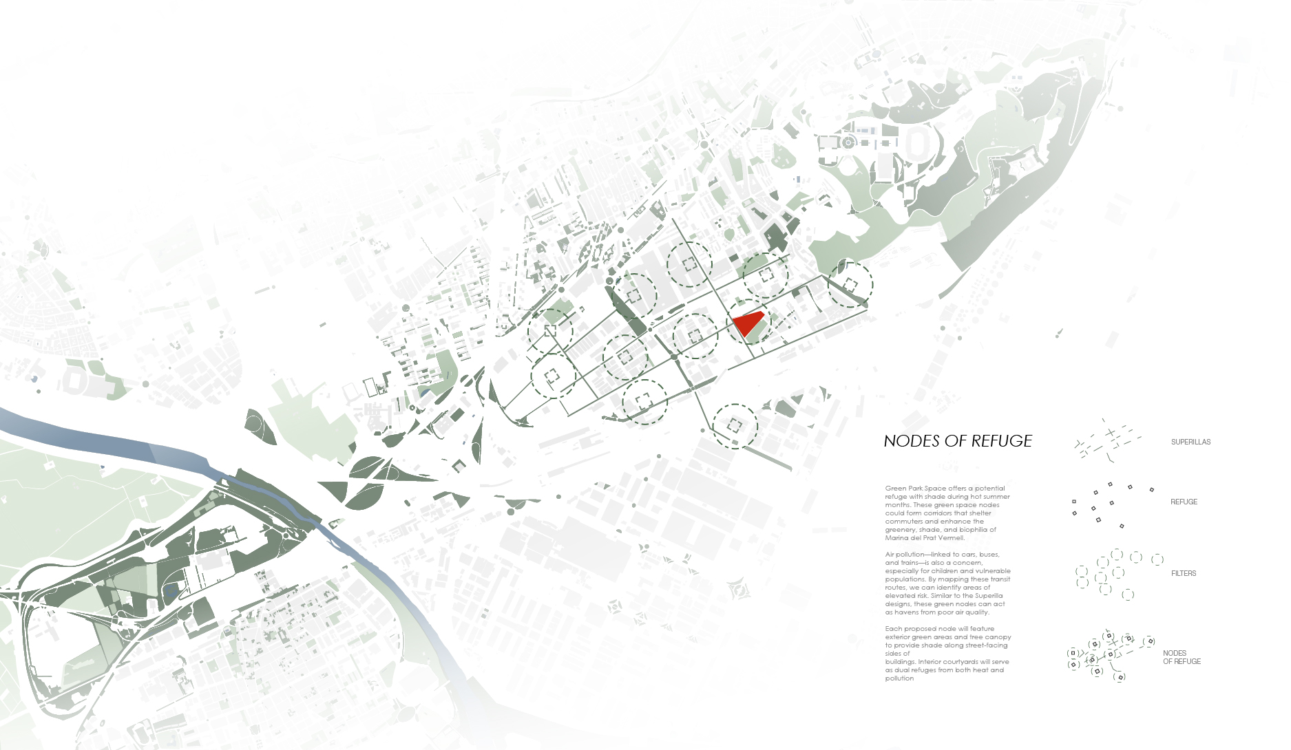 Rising summer temperatures and poor air quality disproportionately affect children and seniors in Marina del Prat Vermell. This project organizes housing and childcare around shaded courtyards and filtered air corridors, using environmental data to locate program and form