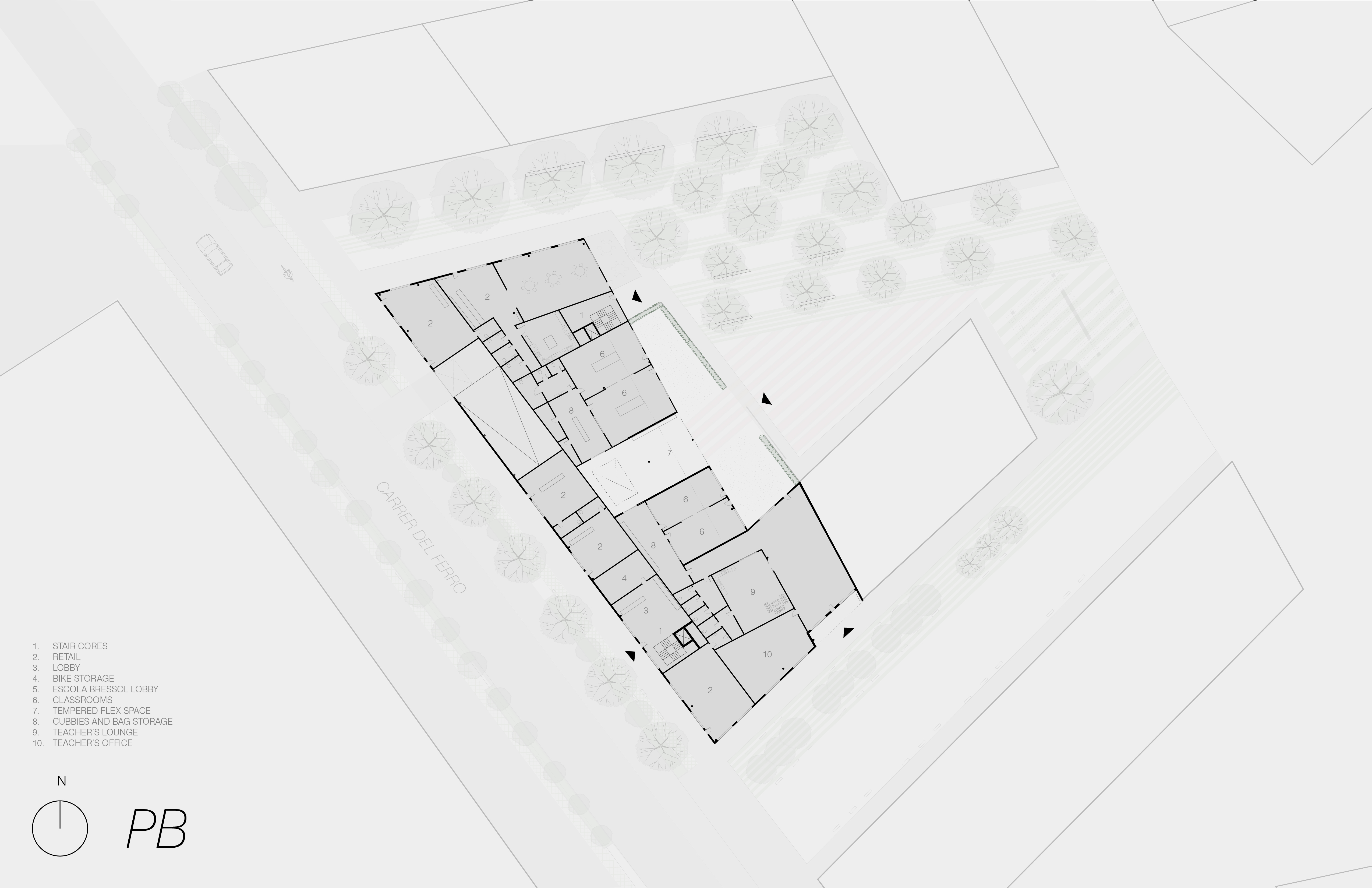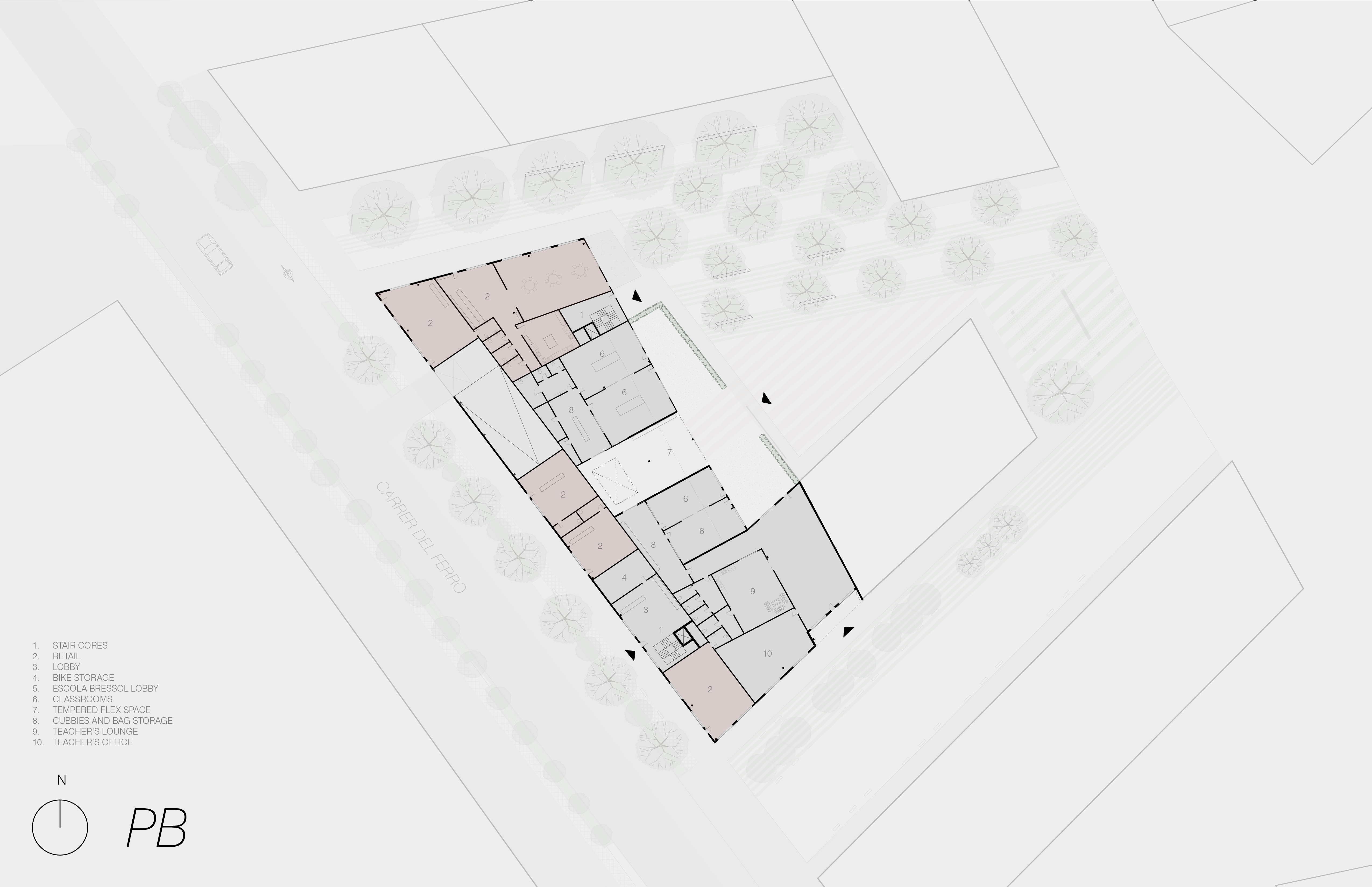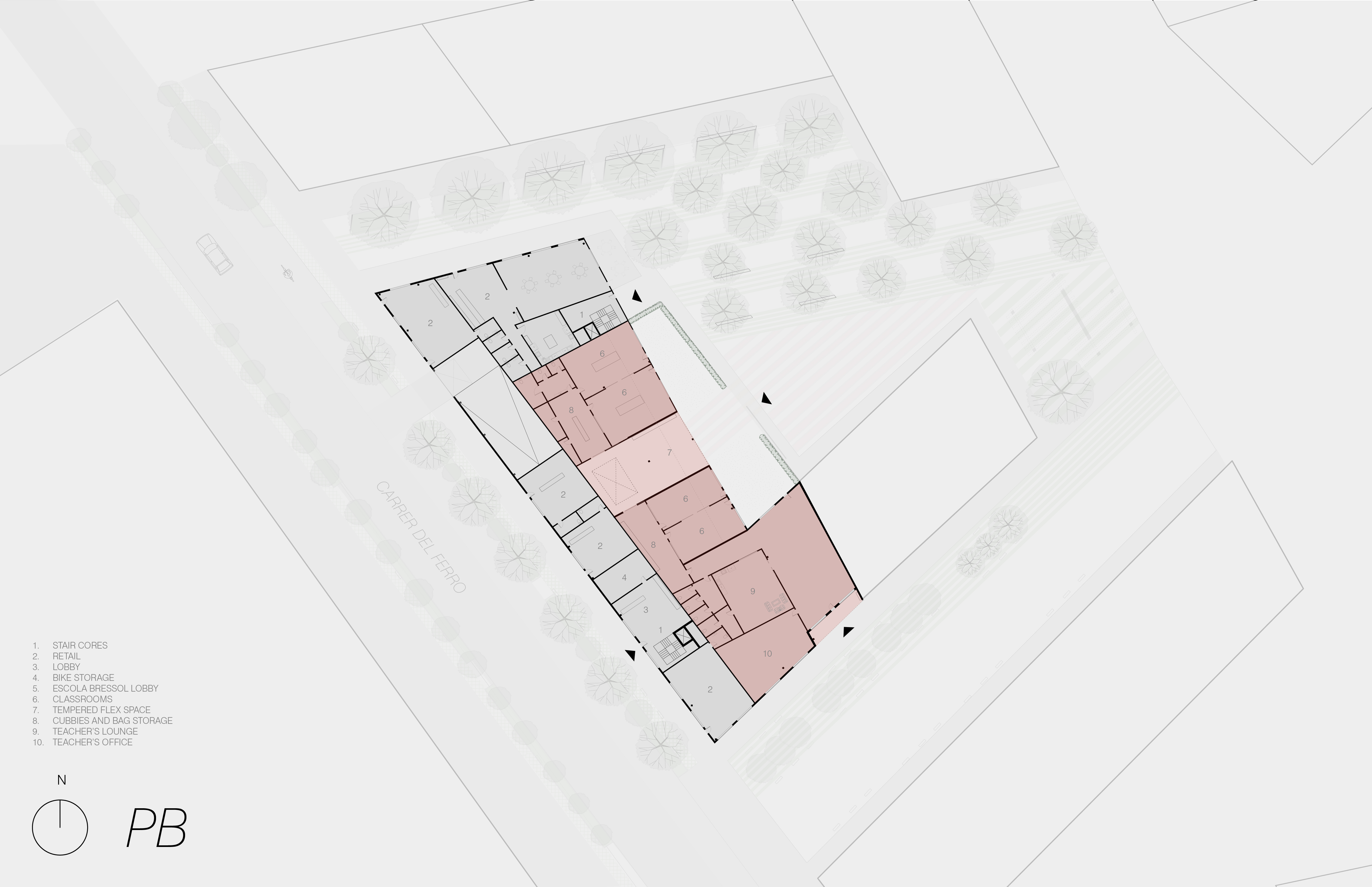 Rising summer temperatures and poor air quality disproportionately affect children and seniors in Marina del Prat Vermell. This project organizes housing and childcare around shaded courtyards and filtered air corridors, using environmental data to locate program and form